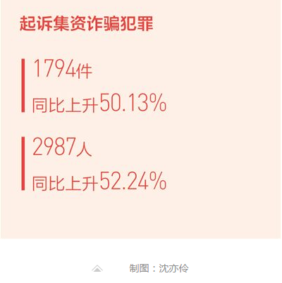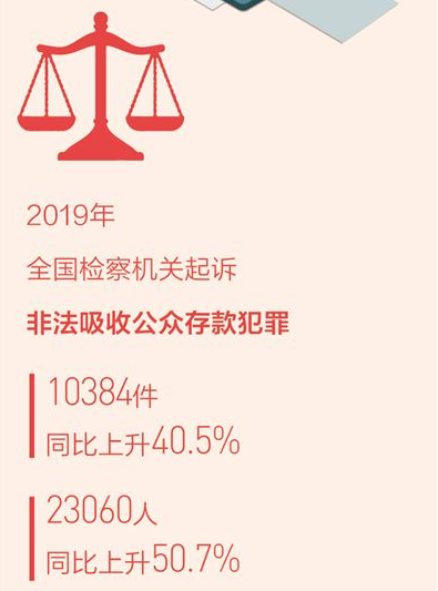 “近年来,金融犯罪呈现持续高发态势,涉众型金融犯罪尤为突出,新类型案件不断增多。”最高人民检察院第四检察厅厅长郑新俭表示,这其中非法吸收公众存款、集资诈骗等非法集资犯罪,特别是利用互联网实施的非法集资犯罪案件持续增加。来自最高检的统计数据显示,2019年,全国检察机关起诉非法吸收公众存款犯罪案件10384件23060人,同比分别上升40.5%和50.7%;起诉集资诈骗犯罪案件1794件2987人,同比分别上升50.13%和52.24%。